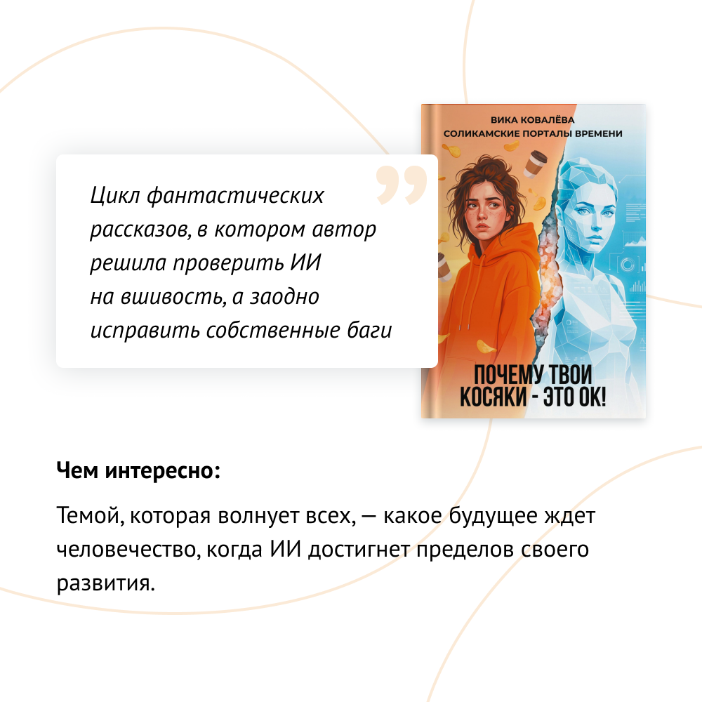 Что, если всё, что ты считаешь своими недостатками — и есть ты настоящий? Студентка МГУ проваливается через соляной туннель в 2045 год и встречает ИИ, который знает о человеческих ошибках больше, чем любой психолог. Эта книга — о том, почему мы верим в ложь, живём в информационных пузырях и боимся быть неправыми. И почему это нормально.