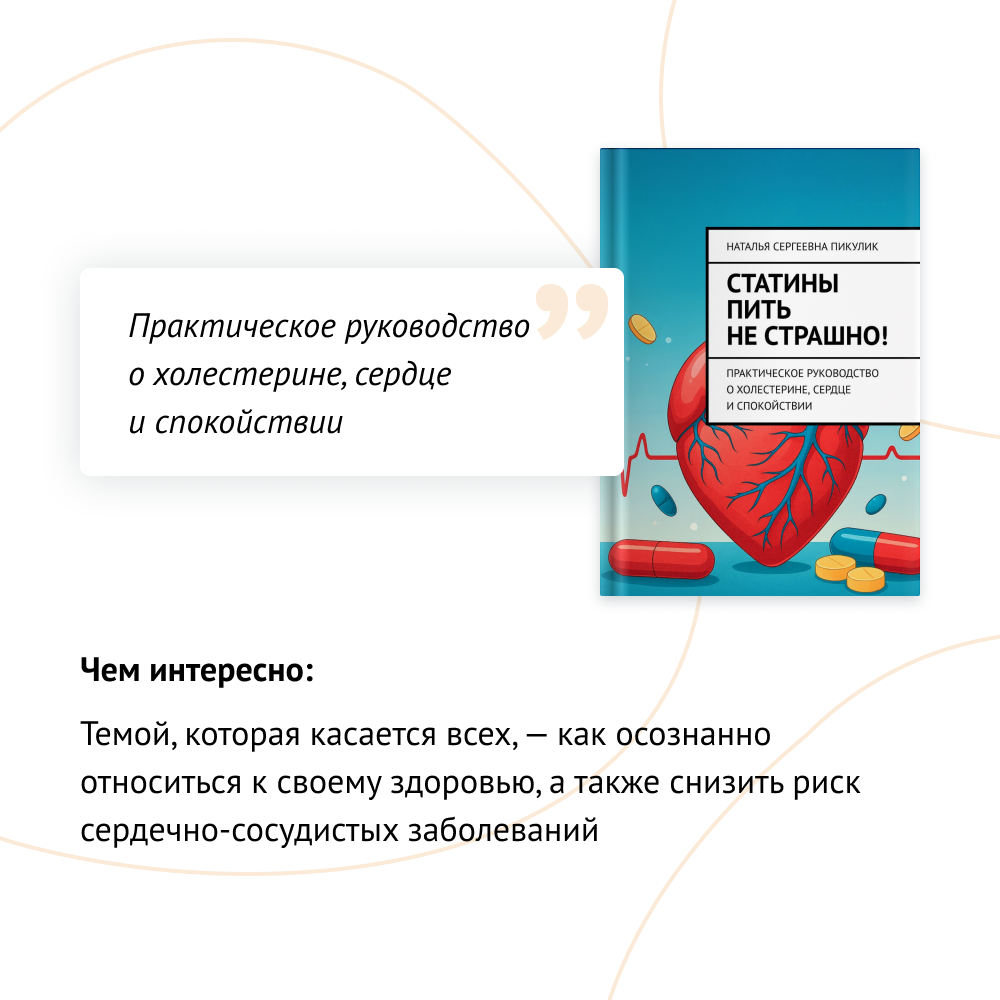 «Статины — пить не страшно!» — честная и понятная книга о холестерине и лекарствах, которые спасают жизни. Врач-кардиолог с пятнадцатилетним опытом объясняет простыми словами, зачем нужны статины и почему их не стоит бояться. Это не учебник, а тёплый разговор между врачом и пациентом — с юмором, доказательной медициной и верой в то, что забота о сердце продлевает жизнь.