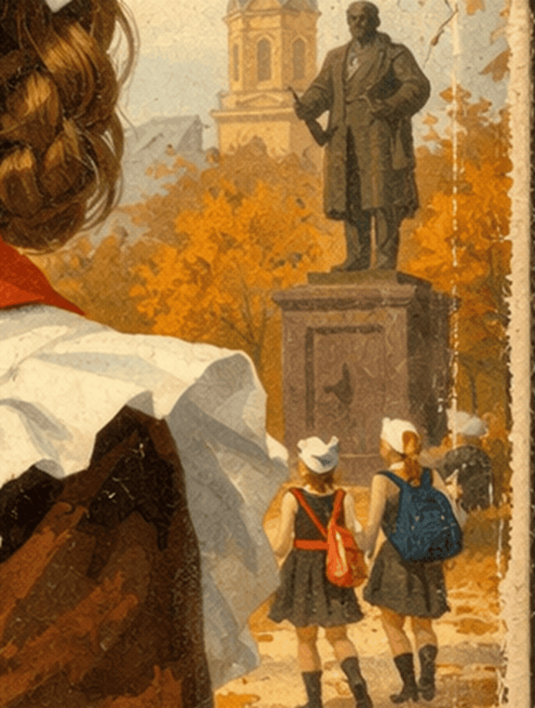 Например, если присмотреться к картинке ниже, мы увидим двух школьниц, которые идут рядом с призраком. И это не говоря о странных, «инопланетных» косынках, неестественном рюкзаке и непонятном предмете в руке Ленина.