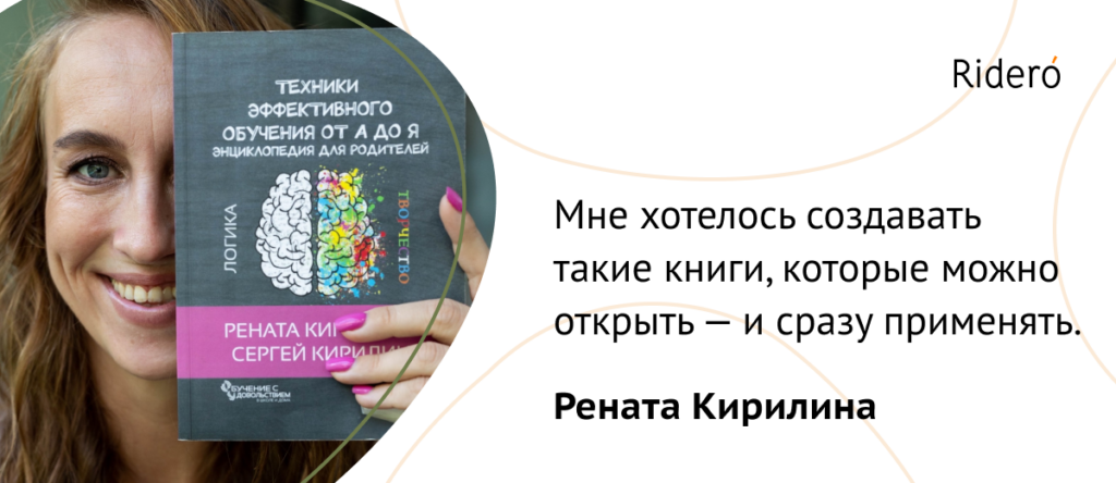 Рената Кирилина более 17 лет работает в сфере образования: как учитель, автор программ и создатель учебных материалов. На Rideró опубликовано 40 ее книг по эффективному обучению детей в школе, продажи которых вышли на тысячи экземпляров. Рената публикует на Rideró не только учебники, но и тетради для дошкольников и учащихся младших классов.