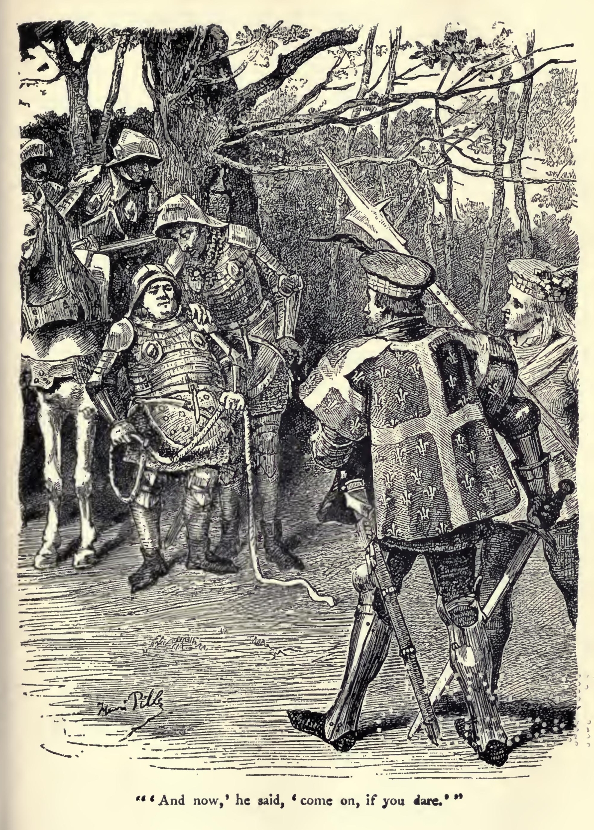 Upon this direct personal appeal, the Cardinal Balue proceeded to lift the gauntlet, with such precaution as one would touch an adder—so great was apparently his aversion to this symbol of war—and presently left the royal apartment to hasten after the challenger.